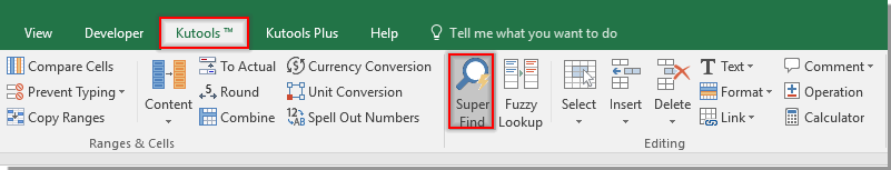 1。 点击 Kutools > 超级查找 启用超级查找功能。