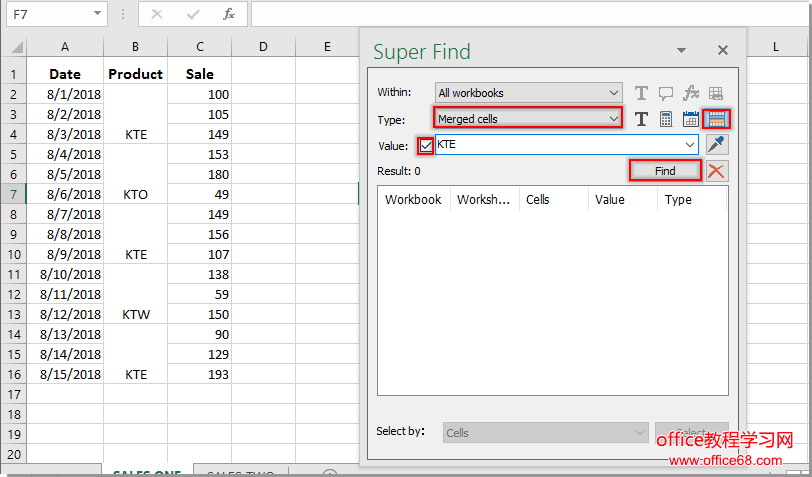 超级查找 实用程序 Kutools for Excel 可以帮助您仅在Excel中的合并单元格中快速查找特定值。 请做如下。