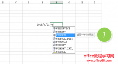 问题:何知道一个日期是一年的第多少周呢?? 解答:利用WeekNum函数搞定。 具体操作如下: 在日期的后面输入=w这是Excel自动出现W开头的函数,单击选择WEEKNUM。如下图1处 紧接着在括号内单击日期所在的单元格,本例为E7单元格。如下图2处。 在上面的状态下直接敲回车键。直接告诉你2015/4/21号在2015年的第17周。是不是...