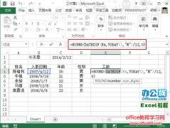 现在很多企业公司为了留住人才,都采用了工龄制,一方面可以留住人才,让他们觉得在这里有前途,另一方面也可以安抚一些老员工,避免引起不必要的争论。下面,教大家如何在Excel2013表格中计算员工的工龄。 思路介绍 先用datedif函数求入职日期到今天相距的月数,然后用月数除以12,得到年数,一般为小数,这里就用到了rou...