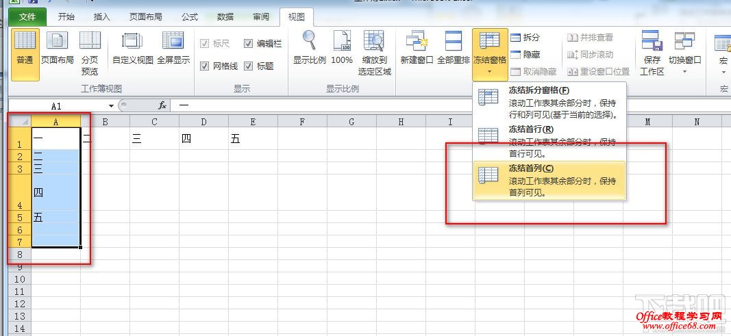 现在是设置首列。选中数字,在到视图,点击冻结窗格,点击冻结首列。