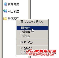 如果要删除已添加的文件夹快捷方式,可以选择要删除的快捷方式,如“2009文档”,鼠标右击,在弹出的快捷菜单中,选择“删除”即可。
