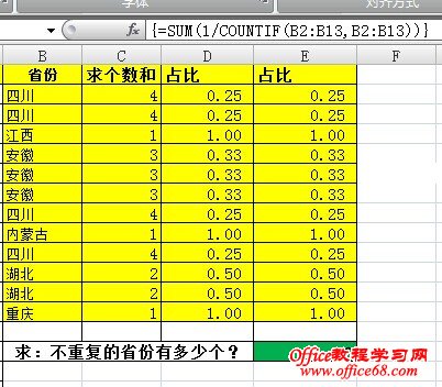 思路分析: 先求出每一行的每个省份在整个B列中出现的个数和,然后再求和,不就是总体个数和吗?但是,有重复的怎么办?不过你看,四川出现了4次,除以4,就算1个;安徽有3个,除以3,也算1个;那么规律就出来了,用1除以每个省份出现的次数,也就是省份的倒数之和相加,最终就是每个不重复的省份和。因此,办法就来了: 首先在C列中输入公式,=COUNTIF($B$2:$B$13,B2),然后下拉公式,就是每行每个省份出现的次数和。 然后,在D列中输入公式:=1/D2,下拉公式,求出倒数。最后,在E列中输入公式:=SUM(1/COUNTIF($B$2:$B$13,B2)),下拉。得出的结果和D列肯定是一样的。 最后,用sum数组公式,=SUM(1/COUNTIF(B2:B13,B2:B13)),然后同时按下数组专用组合键:ctrl+shift+enter,出现了大括号,见下图。 上面D列和E列只是辅助分析过程,意在梳理思路,帮助大家理解最终的公式是怎么分解得来的(案例附件放在尚西学员QQ群共享里,有兴趣的学员可以去下载)。理解这个函数的用法,关键在于两点:一是对countif函数的掌握,尤其是1/countif求倒数,这是个很巧妙的用法,需要结合公式好好领悟;二是对sum数组函数用法的掌握,这些都在尚西excel函数速成入门视频教程里有详细的讲解,其中包含20集excel数组函数视频专辑。总的来说,学习函数,在深刻理解函数含义的基础上,重在学会如何梳理思路,这比学会了多少函数数量更重要。 |