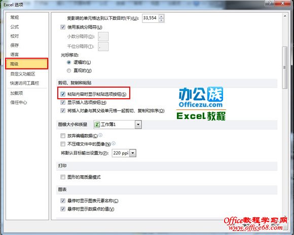 2 进入“Excel选项”,点击“高级”功能框,选择“剪切、复制和粘贴”组中的“粘贴内容时显示粘贴选项按钮”选项,然后点击“确定”按钮。