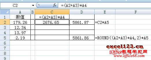 一、语法 ROUND函数可将某个数字四舍五入为指定的位数。其语法为: ROUND(number, num_digits) 参数:number是需要四舍五入的数字;num_digits为指定的位数,number将按此位数进行四舍五入。 1.如果num_digits大于0,则四舍五入到指定的小数位。如A1单元格包含数值“98.35789”,则公式 =ROUND(A1,2) 返回结果:98.36 2.如果 num_digits 等于 0,则四舍五入到最接近的整数。如A1单元格包含数值“98.35789”,则公式 3.如果 num_digits 小于 0,则在小数点左侧按指定位数四舍五入。如A1单元格包含数值“98.35789”,则公式 =ROUND(A1,-1) 返回结果:100 二、实例 在公式中使用ROUND函数,可以消除计算误差。如下例: 上图中A2:A5区域为一些数值,C2单元格为公式“=(A2+A3)*A4”计算结果,并设置该单元格的小数位数为两位。D2单元格为公式“=C2*A5”即“2676.65×2.19”的计算结果,也设置该单元格的小数位数为两位。可以看到,其计算结果是“5861.87”。但是,算式 2676.65×2.19=5861.8635 保留两位小数后应该为“5861.86”。 造成上述误差的原因在C2单元格。C2单元格的显示值是“2676.65”,但这是设置两位小数后显示的结果,其实际值是“(179.26+12.34)×13.97=2676.652”,所以D2单元格中的运算结果是: 2676.652×2.19=5861.86788 设置两位小数后结果就是“5861.87”。 如果要以单元格中显示的数值为准,这里可以用到ROUND函数,在D5单元格中输入公式: =ROUND((A2+A3)*A4,2)*A5 就可以获得正确的计算结果“5861.86”。