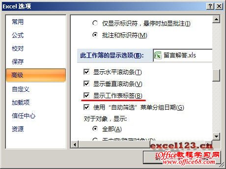 单击“Office按钮→Excel选项→高级”,在“此工作簿的显示选择”区域中,勾选“显示工作表标签”。