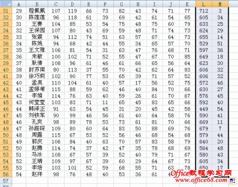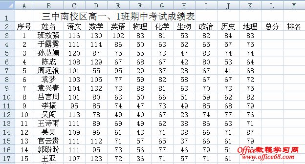 1.运行Excel 2007,按常规制作一个学生成绩汇总工作表。在工作表中的A2到M2区域分别输入序号、姓名和语文、数学、英语等各科以及总分、排名字段,然后输入基本信息并设置文字和表格格式(见图1)。
