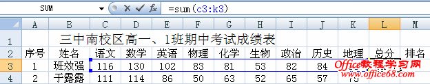 2.输入公式。选中L3单元格,在编辑栏输入“=SUM(C3:K3)”(不含引号,下同),按Enter键确定(见图2)。