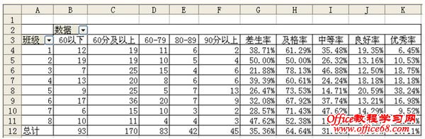 刚才的分析还不够,小荷还要深入分析其他的指标。选中数据透视表所在的A1:E13单元格区域,单击菜单“编辑→复制”,切换到另一工作表内,在任意单元格右击,选择“粘贴”菜单项,即可得到一个复制的透视表,把“数据”字段拖到数据透视表区域外,并把此工作表命名为“深入分析”。把“60以下(差)”字段拖入“请将数据字段拖到此处”中,依次把字段“60分及以上(及格)”、“60-79(中等)”、“80-89(良好)”、“90分以上(优秀)”字段都拖入到“请将数据字段拖到此处”中。最后利用替换法把“求和项:”替换成一个空格,这样每一个班的“优、良、中、差、及格人数”就出来了。