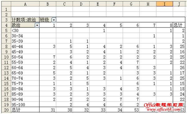小荷根据上面的常规操作再创建一个空的数据透视表,并把此工作表命名为“分数段”。将“班级”字段拖入“将列字段拖到此处”中;将“政治”字段拖入“将行字段拖到此处”中;再将“政治”字段拖入“请将数据字段拖到此处”中。