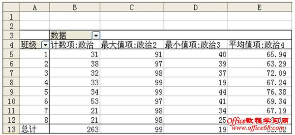 在B4单元格“求和项:政治”上右击,选择“字段设置”菜单项,在弹出的“数据透视表字段”对话框中,选择汇总方式为“计数”,确定。依次把“求和项:政治2”的汇总方式选择为“最大值”;把“求和项:政治3”的汇总方式选择为“最小值”;把“求和项:政治4”的汇总方式选择为“平均值”,单击“ ”按钮,弹出“单元格格式”对话框,根据需要设置单元格格式即可(这里保留2为小数)。