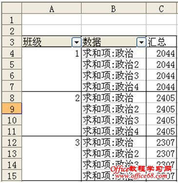 接下来单击空表区域内的任意位置,将会出现放置不同字段类型的提示,并且显示“数据透视表字段列表”对话框,将“班级”字段拖入“将行字段拖到此处”中,将“政治”字段拖入“请将数据字段拖到此处”中。共需拖4次,因为要对政治实考人数、最高分、最低分、平均分4个项目进行统计分析(见图1)。