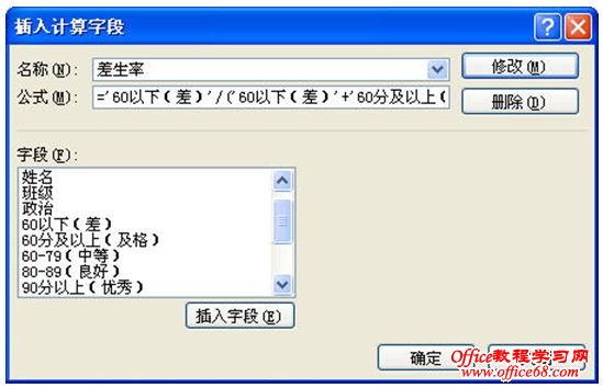 单击工作表“深入分析”内的数据透视表中的任意一个单元格,然后选择“数据透视表→公式→计算字段”,打开“插入计算字段”对话框,在插入计算字段”对话框的“名称”框内输入“差生率”,将光标定位到“公式”框中,清除原有的数据“=0”,在字段列表框中双击“60以下(差)”字段,输入“/”,再输入“(+)”,把鼠标定位到 “+”的前面,双击字段列表框中的“60以下(差)”字段,然后把鼠标定位到 “+”的后面,双击字段列表框中的“60分及以上(及格)”字段。此时“公式”框中显示“='60以下(差)'/('60以下(差)'+'60分及以上(及格)')”(见图3,此公式的含义是不及格的人数/班级人数为“差生率”)。接下来依次创建及格率、中等率、良好率、优秀率等计算字段。根据需要设置“差生率”、“及格率”、“中等率”、“良好率”、“优秀率”的单元格格式(这里保留2为小数,百分比,见图4)。