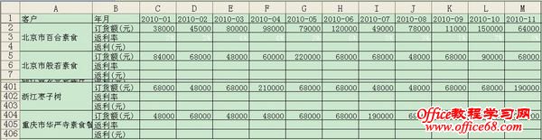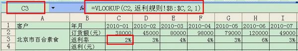 切换到“客户返利表”,在C3单元格中录入一个公式,=VLOOKUP(C2,返利规则!$B:$C,2,1),然后,把公式右拉,看,“北京市百合素食”的返利率就算出来了(见图4)。再筛选所有的“返利率”,把“北京市百合素食”的整行返利率公式下拉填充,其他客户的“返利率”也算出来了(见图5)。取消筛选,看,OK了!(见图6)。