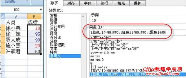 使用了条件格式,给分数分段使用不同颜色显示,很有意义,其实还有更简洁的使用方法,比如大于或等于90分时字体显示成绿色,小于60分(通常是不及格)时显示成红色,我们只要选中需要设定颜色的单元格,点右键“设置单元格格式”,在“数字”标签下使用“自定义”,在格式中输入以下内容:
