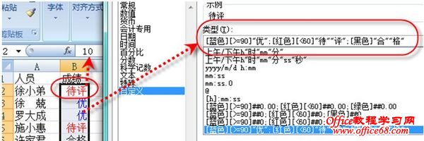 [蓝色][>=90]"优";[红色][<60]"待""评";[黑色]"合""格"