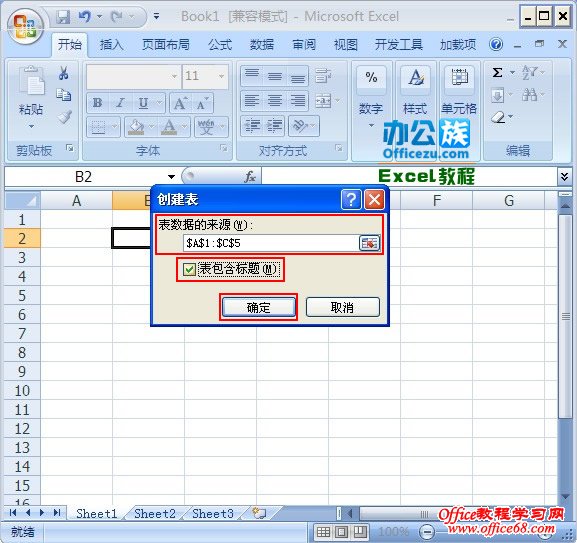 2 此时弹出“创建表”选择创建区域后,勾选“表包含标题”再按“确定”即可。