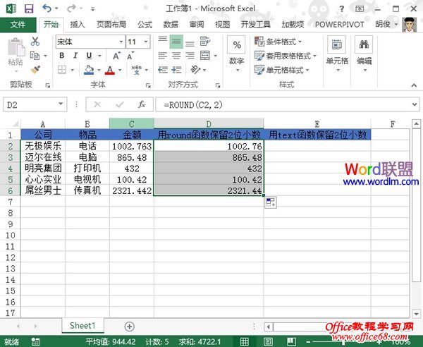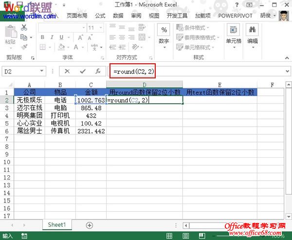 今天我们来说一下保留小数位数时要用到的函数,round和text这两个函数,我会将其用法以及区别跟大家介绍清楚。 实例演示 ①启动Excel2013,输入下面的数据,在D2单元格输入: =ROUND(C2,2)