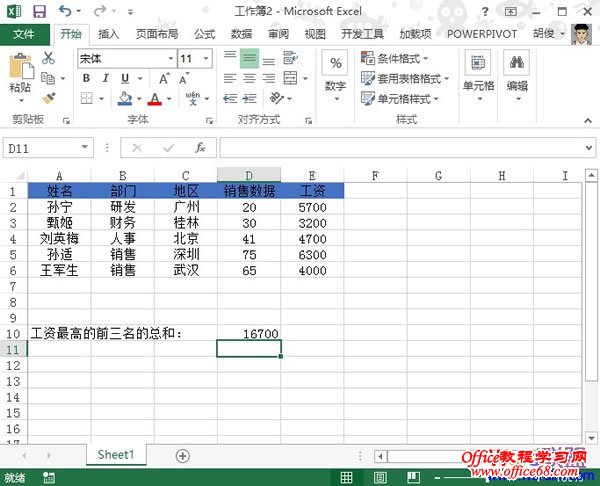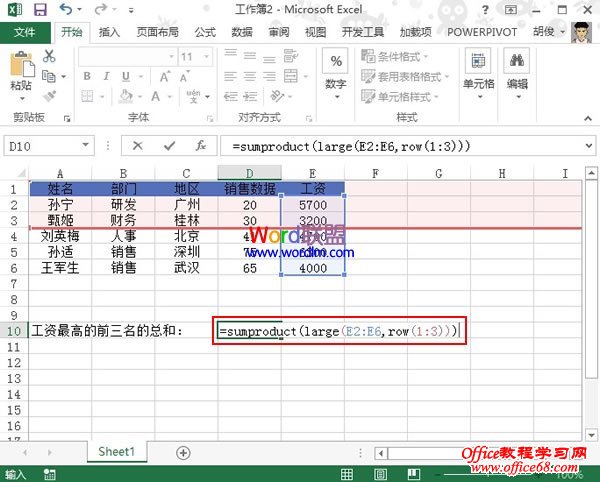 下面是一则单位员工工资情况的统计表,各个部门地区销售数目。要将工资最高的三项求出,计算总和。可能很多人都会想到先利用排序,然后选中前三项最高的值,再来求和。方法是可以,但是利用函数公式岂不是更加简单? 解题思路 row(1:3)返回{1,2,3},large函数会求出E2:E6区域中第1,2,3个最大值,最后,sumproduct函数会对其进行求和。 实例演示 ①启动Excel2013,创建如下所示的数据表格,我们要将工资最高的三项选出来,并求和。在单元格输入公式: =SUMPRODUCT(LARGE(E2:E6,ROW(1:3)))