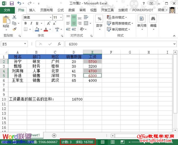 ③我们来看看结果对不对,图中红色数字的为最高的三项,选中这几个单元格,下方看到求和为16700,正确。