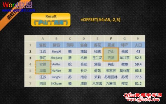 ②再来看看参数为负的意义,OFFSET(A4:A5,-2,5),又是省略了后面2个参数,类似上面的例子,可想而知,返回的也应该是类似的,是一个两排的数据。-2,5,向反方向偏移,也就是向上偏移2个单位,向右偏移5个,结果那就是庐山西湖。