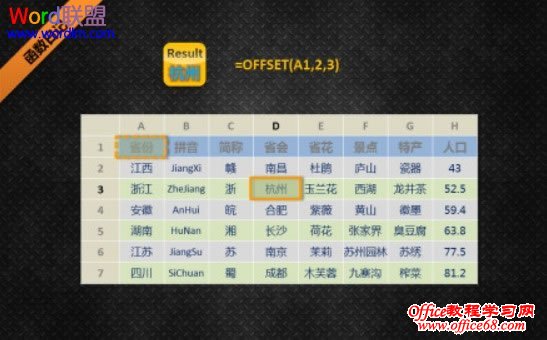 注:表示引用区域的高度和宽度,两个参数均可省略,在省略的情况下默认与基准区域的维度尺寸相一致。 实例剖析 ①下图,OFFSET(A1,2,3)省略了后面2个参数,表示与选定的区域尺寸一致,向下偏移2行,向右偏移3列,所以得到的结果就是杭州。