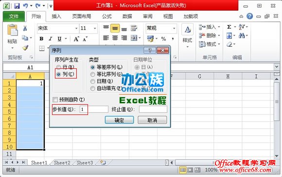 3 在弹出的选项框中,把行改为列,如果勾选的是等差数列,那么步长值就是指公差。