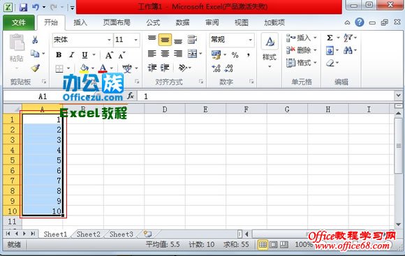 1 打开Excel,在A1单元格输入数字1,然后按住Shift,在按A10单元格,这样就选中了A1:A10。