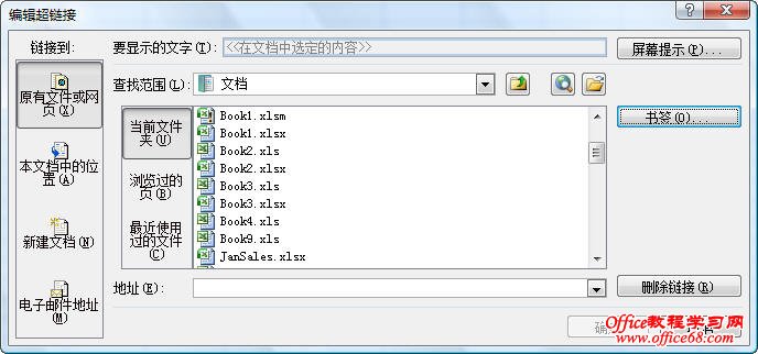 要显示的文字:单元格中显示的超链接文本,如果原单元格中包含文本,打开该对话框时将直接显示该文本。如果是公式或数值等,此处将显示灰色的“在文档中选定的内容”。