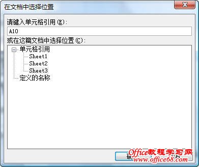 原有文件或网页:选择该选项可以将连接目标设置为已存在的某个工作簿、Word文档、应用程序或网页。如果连接目标为Excel工作簿,可以单击右侧的“书签”按钮,打开“在文档中选择位置”对话框,在其中设置要打开该工作簿中的位置。如下图中打开的位置为某个工作簿中“Sheet3”工作表中的“A10”单元格。