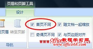 2.单击某个页面的页脚,Excel自动切换到“页眉和页脚工具”的“设计”选项卡中,在“选项”组中,勾选“首页不同”。