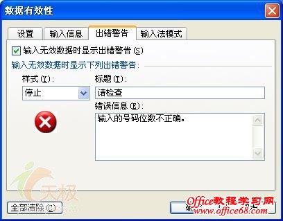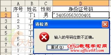 由于身份证号码多达15或18位,输入起来容易出错,同样可以通过设置“数据有效性”,当输入的位数不对时,给出提示: 选中需要输入身份证号码的单元格区域(如D2至D101),打开“数据有效性”对话框,在“自定义”“公式”下面的方框中输入公式:=OR(LEN(D2)=15,LEN(D2)=18),并设置一个“出错警告”(如图1),确定返回。 这样,但输入的号码位数不正确时,系统会给出提示(出错警告设置的内容,如图2)。 注意:如果将此公式与《避免在Excel中输入重复数据的方法》介绍的公式结合起来使用,就更方便了。结合后的公式是:=AND(COUNTIF(D:D,D2)=1,OR(LEN(D2)=15,LEN(D2)=18)) |