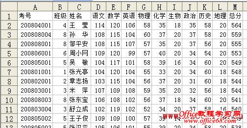 由于要使用数据透视表,可以将各班考生成绩汇总到一个工作表中,其中第一行为行标题。如果某学科有缺考的学生,在对应单元格中要输入数值“0”,即确保区域中没有空白项。