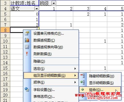 3.选择数据透视表,从“数据透视表字段列表”窗口中将“班级”字段拖动到列区域中,将“语文”字段拖动到行区域,将“姓名”字段拖动到数据区域中。在行区域中右击任意单元格,在弹出的快捷菜单中选择“组及显示明细数据→组合”。