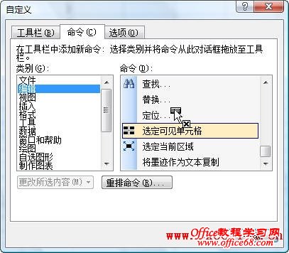 2.选择“命令”选项卡,在“类别”下选择“编辑”,在右侧“命令”下方区域中选择“选定可见单元格”,将该命令拖动到工具栏中。