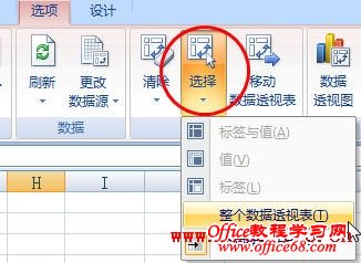 1.选择数据透视表中的某个单元格,在功能区中选择“选项”选项卡,在“操作”组中,单击“选择→整个数据透视表”。