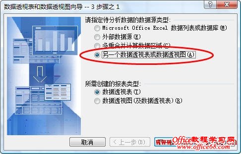 2.在Excel 2003中,单击菜单“数据→数据透视表和数据透视图”, 在弹出的对话框中,选择“另一个数据透视表或数据透视图”,单击“下一步”按钮。在Excel 2007中,先按快捷键“Alt+D”,然后按“P”键,启动数据透视表和数据透视图向导。