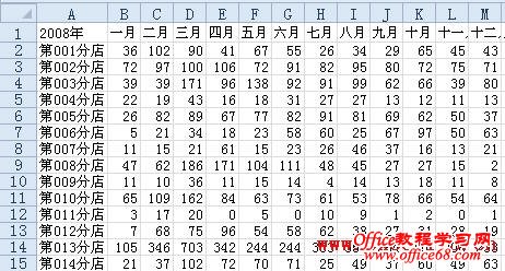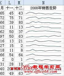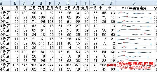 迷你图(Sparklines)是Excel 2010中的一个新增功能,它是绘制在单元格中的一个微型图表,用迷你图可以直观地反映数据系列的变化趋势。与图表不同的是,当打印工作表时,单元格中的迷你图会与数据一起进行打印。创建迷你图后还可以根据需要可以对迷你图进行自定义,如高亮显示最大值和最小值、调整迷你图颜色等。在Excel 2010中创建迷你图非常简单,下面用一个例子来说明。假如某公司的各分店2008年每月的销售数量如图所示。对于这些数据,很难直接看出数据的变化趋势,而使用迷你图就可以非常直观地反映各分店2008年的销售走势情况。在Excel 2010中目前提供了三种形式的迷你图,即“折线迷你图”、“柱形迷你图”和“盈亏迷你图”,由于数据区域在B2:M15区域中,本例在N2:N15区域中创建“折线迷你图”,步骤如下:
