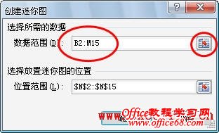 2.在弹出的“创建迷你图”对话框中,在“数据范围”右侧的文本框中输入数据所在的区域B2:M15。也可以单击右侧的按钮用鼠标对数据区域进行选择。由于在第一步中已选择了N2:N15区域,“位置范围”已由Excel自动输入了。