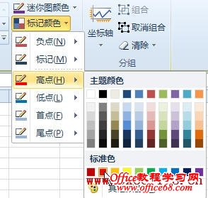 4.高亮显示最大值和最小值。对于迷你图组,可以同时对其中的各迷你图进行设置。选择N2:N15中的某个单元格,这时整个迷你图组就被选择了,在功能区中增加了“迷你图工具”及“设计”选项卡。选择“设计”选项卡,在“样式”组中单击“标记颜色→高点”,选择某种颜色作为最大值标记颜色,本例中选红色。用同样的方法设置“低点”颜色。