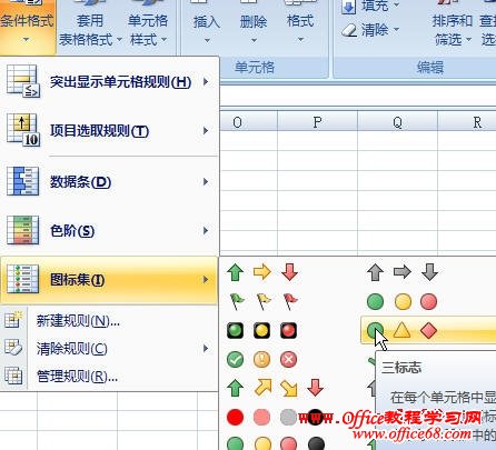 在Excel2007中新增了一种图标集条件格式,它可以用图标来反映某单元格中的数值在整个数据组中的位置情况。例如在三标志图标集中,用绿色的圆形表示较高的数值,用黄色三角形的表示中间值,用红色的菱形表示较低的数值。这些图标放置在每个单元格中,看起来十分直观。