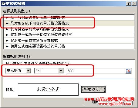 2.保持选择数据区域,再次单击“条件格式→管理规则”,弹出“条件格式规则管理器”,单击“新建规则”按钮。弹出“新建格式规则”对话框,选择第二行的“只为包含以下内容的单元格设置格式”,在中间的下拉列表中选择“小于”,在右侧的文本框中输入一个数值。本例中要让数值在“800”以下的单元格中的图标隐藏起来,此处输入数值“800”,单击“确定”按钮。