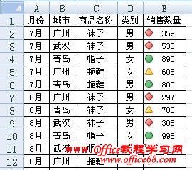 选择数据区域,在功能区中选择“开始”选项卡,在“样式”组中单击“条件格式→图标集”,选择“三标志”图标集。设置后的效果如上图所示。