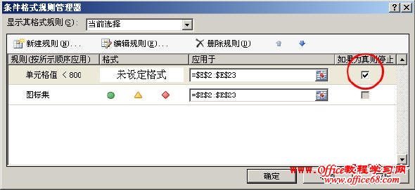 3.Excel返回“条件格式规则管理器”对话框中,可以看到其中有两个条件格式规则,第一条为新设置的条件格式规则。勾选第一条规则后的“如果为真则停止”选项。选择该选项后,可以使后面的条件格式规则中包含相同条件的规则停止执行。因而本例中第二个条件格式规则仅仅使数值大于或等于“800”的单元格显示图标,而对于数值小于“800”的单元格,由于在第一个条件规则中未设置任何格式,看上去没有变化。