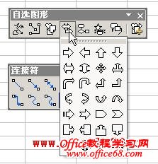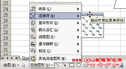 Excel2003中的“绘图”工具栏集成了许多绘图工具和调整工具,如绘图工具中的“自选图形”菜单包括各种线条、连接符、基本形状等,如果要经常使用某个绘图工具,可以将该工具菜单变成浮动工具栏,以方便使用。步骤如下: 1.如果“绘图”工具栏没有显示,可以单击菜单“视图→工具栏→绘图”显示“绘图”工具栏。 2.假如要将“连接符”子菜单变成浮动工具栏,在“绘图”工具栏中单击“自选图形→连接符”,显示“连接符”子菜单。将鼠标指针移动到该子菜单的上部有虚线的位置,可以看到Excel会给出“拖动可以使此菜单浮动”的提示。 3.按住鼠标左键,将“连接符”子菜单拖动到工作表中,该子菜单就会变成浮动工具栏。 如果要使整个“自选图形”菜单变成浮动工具栏,除了用上述拖动的方法外,还可以单击菜单“插入→图片→自选图形”。 |