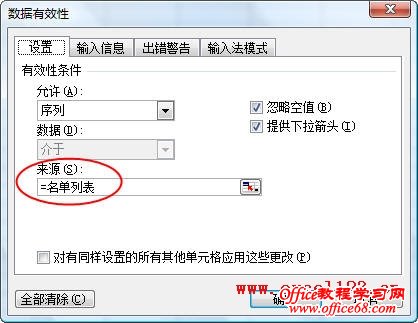 3.在要创建数据有效性下拉列表的工作簿中,定义一个新的名称。在Excel 2003中,单击菜单“插入→名称→定义”,在“定义名称”对话框中,输入一个名称如“名单列表”,在“引用位置”下方的文本框中输入: