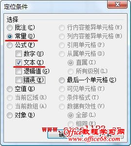 如果Excel单元格中的数据类型非常多,如有的单元格中为数字,有的为公式或文本等。要仅选择包含某一种类型数据的单元格,可以用“定位”的方法。以选择工作表中包含文本的单元格为例,步骤如下: 1.选择某个单元格,按F5键打开“定位”对话框。如果选择某个区域再按F5键,Excel将只会在该区域中查找。单击“定位条件”按钮。 2.选择“常量”,可以看到在“公式”下方的4种类型复选框“数字”、“文本”、“逻辑值”和“错误”已由灰色变为黑色可用状态。去掉其他选项,仅保留“文本”,单击“确定”即可选择工作表中所有包含文本的单元格。如果单元格中的文本是由公式返回的结果,则不在选择范围内。另外,这4个复选框还适用于“公式”选项,用于选择公式返回结果为这几种类型的单元格。 |