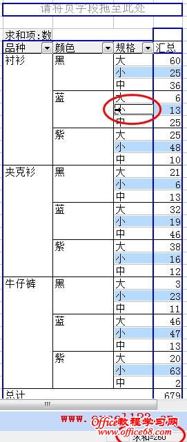 如果Excel数据透视表的行区域中包含多个字段,我们可以用下面的方法在数据透视表中快速选择相同的项目以查看其计算结果。例如在下图的数据透视表中如果要查看所有“规格”为“小”的全部商品的数量和或计数值等,就可以先把光标放到“规格”行字段区域中某个内容为“小”的单元格内,然后向左侧移动光标到左侧接近左边框的边缘位置,这时鼠标指针会变成黑色向右方向的箭头状,单击一下鼠标,即可选择数据透视表中所有内容为“小”的单元格,然后就可以在Excel状态栏中查看计算结果。 |