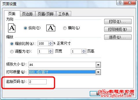 2 在“起始页码”右侧的文本框中,将“自动”改为所需的工作表开始页的页码。