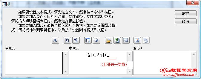 2 单击“自定义页脚”按钮,在中间的文本框中输入“&[页码]+1 ”,注意输入时不包括引号,且“+1”的后面有一空格。如果没有这个空格,首页的页码将显示为“11”的式样。依此类推,如果需要从第8页开始设置,则输入“&[页码]+7 ”即可。